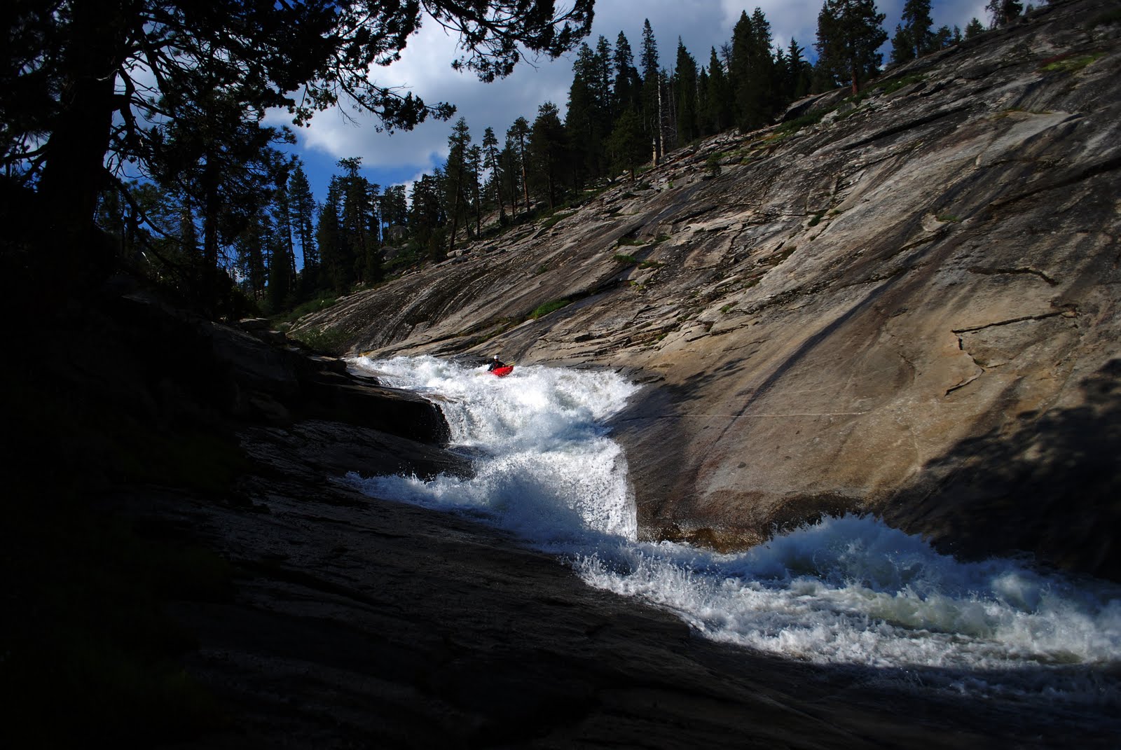 Clover Creek is high in the Kaweah Drainage in Sequoia National Park and is actually a tributary of the Marble Fork of the Kaweah. I wouldn’t call it a legitimate creek run, it is more of a hike and huck adventure in a beautiful setting. The runnable section of Clover Creek is really a long series of cascades that make up a single impressive granite slide. A short hike down the trail from the parking lot led us to the creek. We continued to hike upstream on river right, first reaching the bottom of the slides and then continuing upstream to what seemed like the logical place to put-in. We dropped our boats and then hiked the length of the slide a couple times, scouting and planning our runs.
