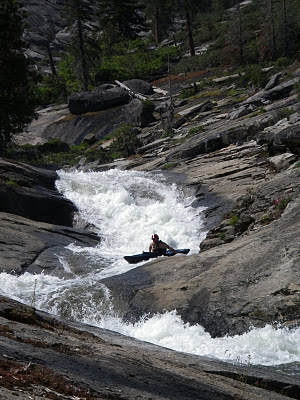 If any short stretch of the Shatner Ranch run ended in a pool, the run would be considered easy class IV. However, due to the continuous nature and non stop gradient, any mistakes would be quickly complicated and with no pools throughout the run, recovery could be difficult. This was demonstrated about a third of the way into the run when Leigh and John got tangled up and ended up taking a tandem swim. Thanks to quick moves by Greg, both swimmers got to shore pretty quickly, but the gear recovery took a bit more time. Luckily all was recovered and we proceeded downstream with a more cautious approach. Under different circumstances this might have been one of my favorite rivers of the trip. However, my strained shoulder was becoming more painful with every left brace and when the take-out bridge came into view, rather than wishing for another run, I was relieved to be done. Our combined crews then proceeded into Sequoia National Park to camp for the night and position ourselves for our next objective, Clover Creek.