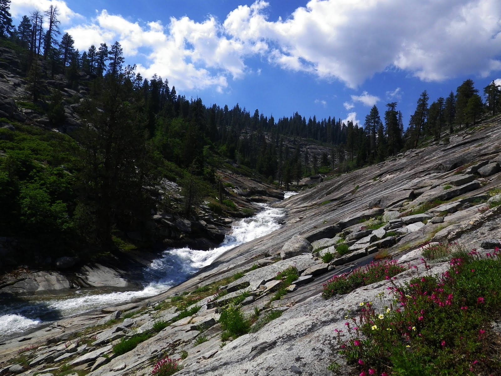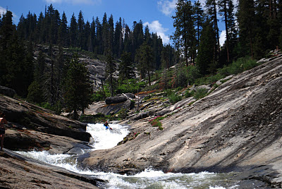 Greg was the first to make a go of it and then the rest of us made our runs one at a time while the others would position themselves at different points along the slide. Some in the group hiked back to the top for multiple runs on this impressive series of slides. I couldn’t resist running it once, but considering the state of my shoulder I didn’t want to press my luck. Between the smooth granite, beautiful cascades, and wildflowers lining the banks I just focused on shooting more and more photos of this special place. Despite the fact that we did relatively little boating that day, in retrospect it was one of my favorite parts of the trip. Seeing giant sequoias for the first time, running an awesome slide in an idyllic setting… what more could anyone ask for.