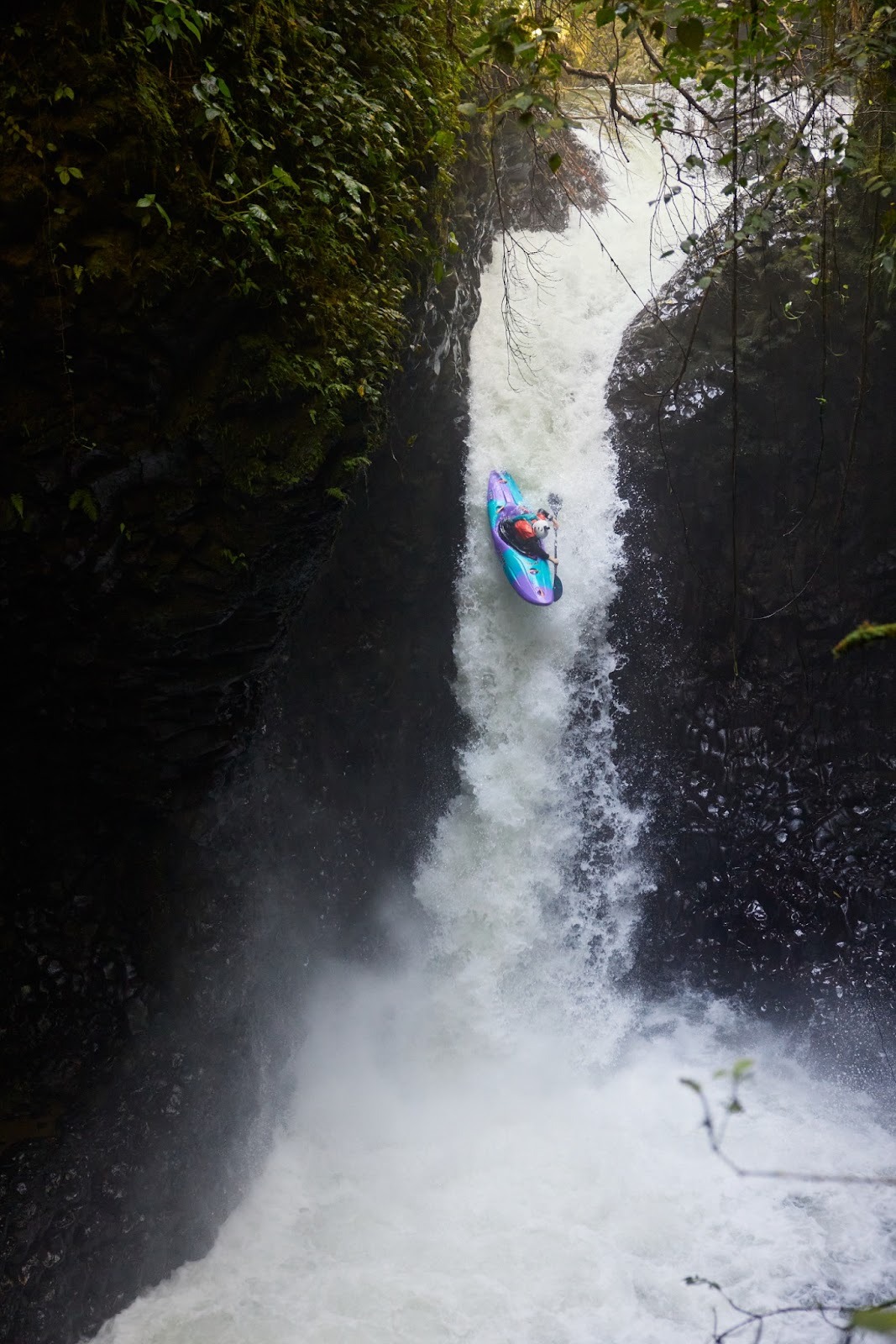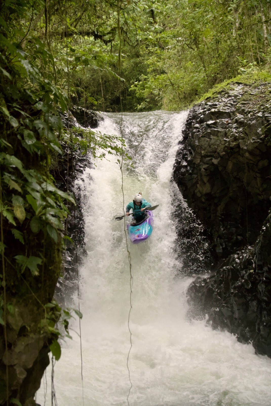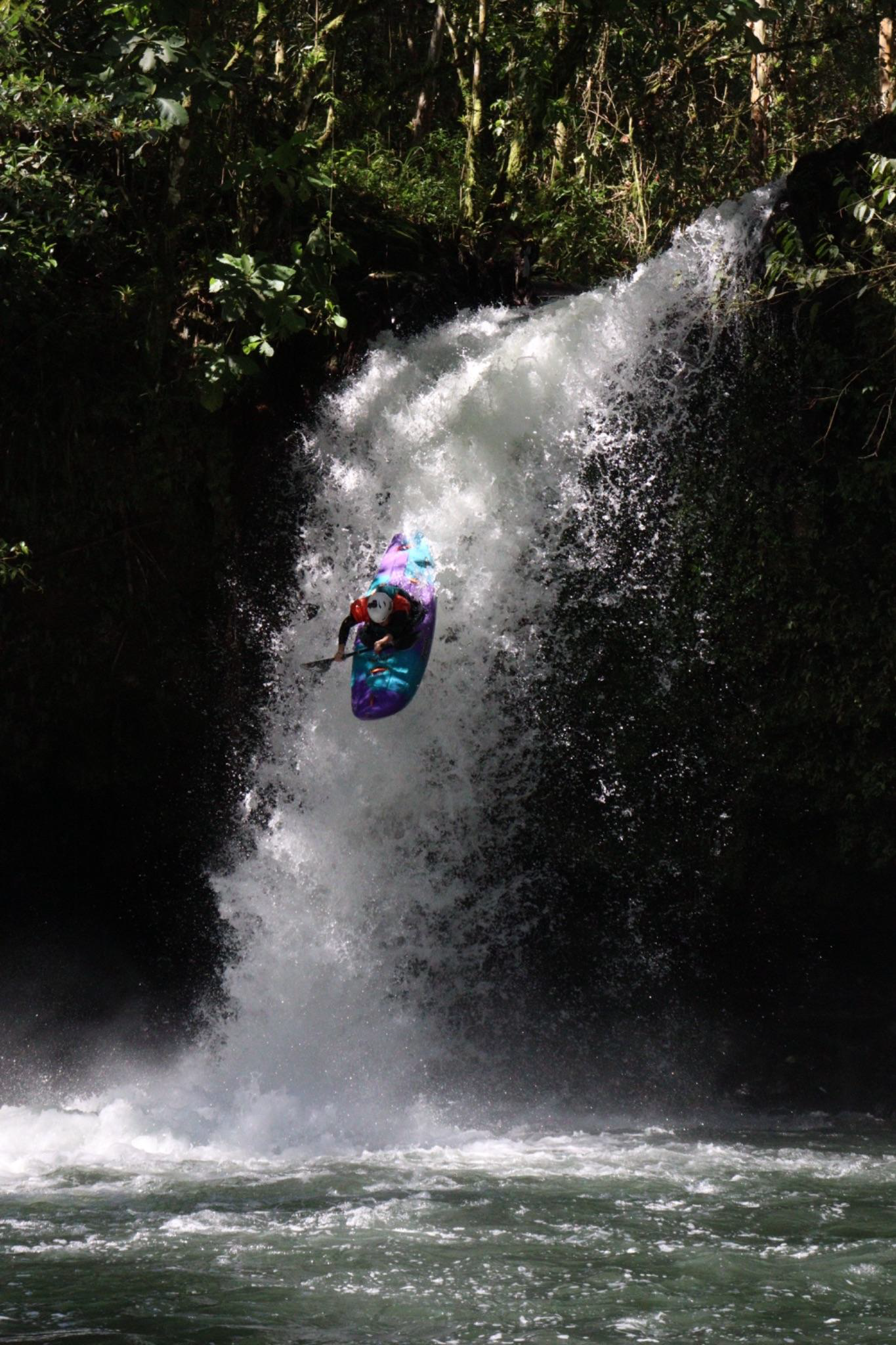 The highlight of my trip, however, has to lie in the absolutely stunning Big Banana section. My month-long stay saw me running this section quite a few times, including the day after I broke my nose on Roadside. The beauty of Big Banana lies in experimenting with techniques, talking through lines with friends, and chasing the ‘perfect’ run where each drop is styled. My favourite ‘throw and go’ is also on this section, which requires you to throw your boat and paddle off the top of a waterfall (Silencia), and jump in after them. My last lap of Big Banana saw me running this waterfall, after a lot of mentally dialling in the line so as not to get pushed left into the cave. I was pleased to have a nice line, although a slightly flatter landing than I would have hoped.
