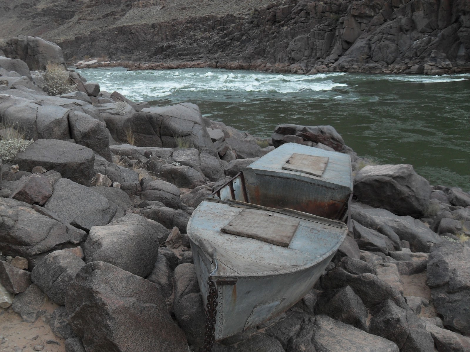 Below: A beast of a metal boat abandoned by early river runners, by Ruby Compton