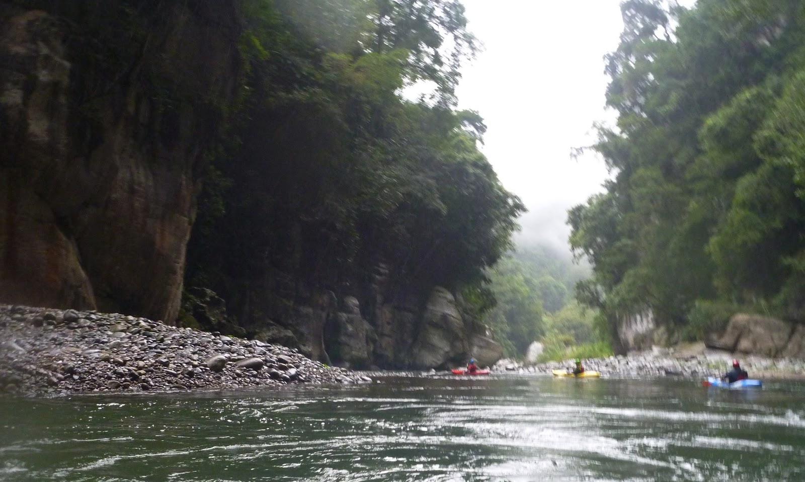 Much of the trail had been stabilized by the placement of large rounded rocks, somewhat like cobblestones paving the surface, but larger, rounder, and on this day, covered in a thin veneer of mud and algae. The next hour was a test for our knees and ankles as we negotiated the slick, rocky trail down into the valley. As we gingerly proceeded, step by careful step, a few local men jogged past us heading to the river as well, but instead of kayaks they carried fishing nets draped around their necks. Another local passed us heading uphill leading his sure-footed mule up the tough trail. Eventually, the steep path emerged on the floor of the valley and with knees screaming, we left the trail and cut across a grassy field covered in boulders to reach the river.